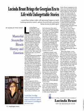 Lucinda Brant’s passion, dedi- cation, and masterful storytelling set her apart as one of historical fiction’s brightest talents. Her advice to aspiring writers reso- nates deeply: trust your passion, immerse yourself in research, and always remember that story is at the heart of it all. Through her work, Brant reminds us that the past is not so distant after all—it is a mirror through which we explore timeless truths, emotions, and connections. For readers and writers alike, her novels are a testament to the power of history to inspire, educate, and above all, entertain.