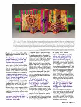 EDITOR’S NOTE: Diane Pieri’s work is a vibrant, dynamic exploration of color, pattern, and form, embodying her signature fusion of cultural influences and contemporary innovation. The accordion-style folding artwork dazzles with bold hues—magenta, yellow, purple— and intricate motifs reminiscent of Indian miniatures and folk art, reflecting her decades-long reverence for cross-cultural storytelling. The piece’s rhythmic circles and organic shapes evoke joy and movement, while its layered structure invites interaction, mirroring Pieri’s belief in art as an immersive experience. Her use of authentic materials and meticulous craftsmanship shines through, reinforcing her commit- ment to beauty and authenticity. This work is a testament to her fearless creativity, blending tradition with playful experimentation to create a visual symphony that resonates with emotional depth and exuberance.