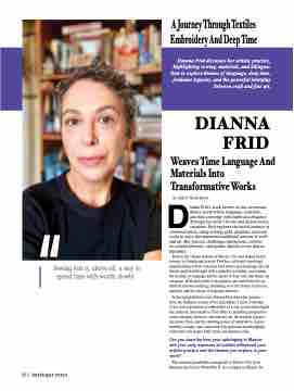 to her own exploration of embroidery as a way to intertwine legibi- lity, memory, and narrative. Frid offers a compelling perspective on the interplay between craft and fine art, the feminist legacies she draws from, and the enduring power of materials to inspire humility, wonder, and connection. Her generous and thoughtful reflections will inspire both artists and admirers alike.