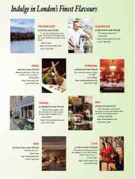 Indulge in London’s Finest Flavours AMAYA Motcomb St, London SW1X 8JT “What an experience! Food was stellar, service excellent.” – Robin Rocks https://www.amaya.biz +44 20 7823 1166 THE RIVER CAFÉ Rainville Rd, London W6 9HA “A very busy and popular resta- urant. They pack a lot of diners into the space and limit your table to two hours.” LE GAVROCHE 43 Upper Brook St, London W1K 7QR “An amazing experience!” – Simon Nutt https://www.le-gavroche.co.uk +44 20 7408 0881 GYMKHANA 42 Albemarle St, London W1S 4JH “One of the best meals we have ever had. ” – Sean Phillips https://gymkhanalondon.com +44 20 3011 5900 BRAT 4 Redchurch St, London E1 6JL “The atmosphere was relaxed but great to see the open kitchen and watch the food being prepped.” – Dominic Michaelis https://bratrestaurant.co.uk +44 20 3011 1800 LOUIE 13-15 West St, London WC2H 9NE “Everything was amazing. From the ambiance, to the New Orleans cuisine to the service...” – Crispy Cakes https://louie-london.com +44 20 8057 1100 TRISHNA 15-17 Blandford St, London, W1U 3DG “The food was exquisite, and the masterful use of spices eleva- ted each dish to another level!” – Karen Wood https://www.trishnalondon.com +44 20 7935 5624 IKOYI 180 Strand, Temple, London WC2R 1EA “Oh Wow oh wow!” – Debs Lister https://ikoyilondon.com +44 20 3583 4660 – Stuart Cooke https://www.rivercafe.co.uk/ +44 20 7386 4200
