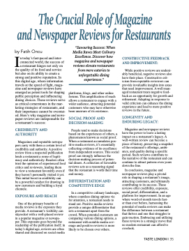 Magazines and reputable newspa- pers carry with them a certain level of credibility and authority. A positive review from a respected publication lends a restaurant a sense of legiti- macy and authenticity. Readers often trust the opinions of experienced food critics and reviewers, leading them